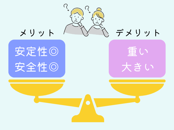 1つ目は、安定性や安全性を重視するか軽くてコンパクトなことを重視するかというポイントです。