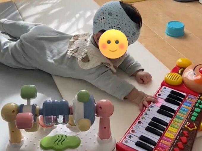 - 7ヶ月:うつ伏せ姿勢で、手のひら全体を使って叩いていました。