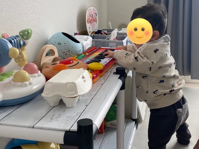 1歳半頃からはどの鍵盤でどの音(効果音)が鳴るかを覚えて鍵盤を押す様子も見られます。